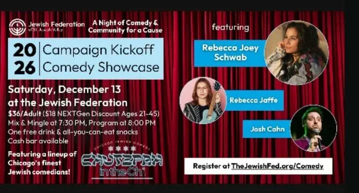 The Jewish Federation's 2026 Annual Campaign is kicking off with an evening of laughter and Jewish joy, featuring some of Chicago's finest Jewish comedians. Chutzpah in the Chi is coming to South Bend, with Rebecca Joey Schwab, Rebecca Jaffe, and Josh Cahn bringing their best Jewish material, songs, humor & heart! You won't want to miss it!